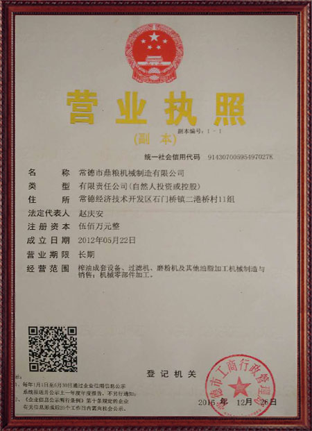 企業(yè)堅持“質量、口碑就是我們的生命”的原則,嚴格執(zhí)行質量標準檢驗體系。生產(chǎn)的"鼎糧"牌系列產(chǎn)品,產(chǎn)品質量優(yōu),性價比高,深受廣大新老客戶的青睞,通過了各級部門的鑒定認可,立式、臥式液壓榨油機均榮獲農(nóng)機推廣證。